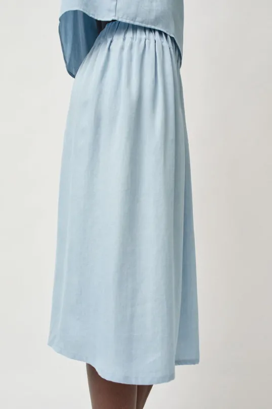Mid-length a-line skirt cut in super soft tencel. Easy, lightweight fit and feel with an elasticated waistband. For the full look, wear with the Vladimir Karaleev Basic Tank in Light Blue Tencel.