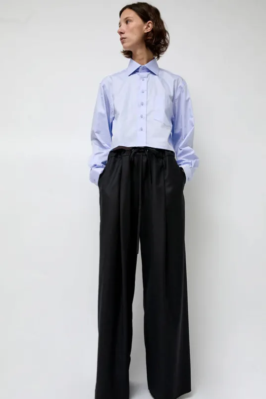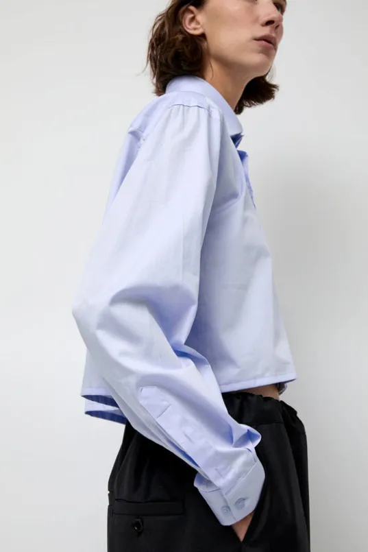 Crisp cotton poplin button-down in classic blue shirting. Cropped silhouette. An update on a classic.