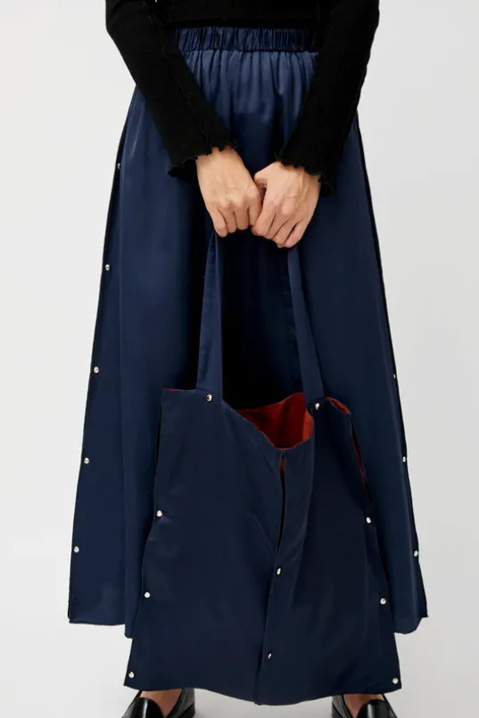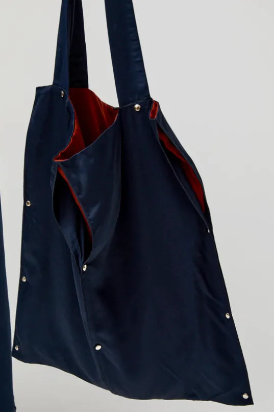 Soft Ecovero viscose tote bag with hemp lining and interior pocket. Features slit and rivet detailing at edges and center. A perfect everyday bag.