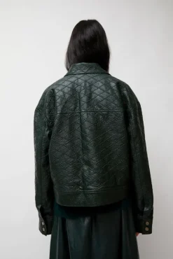 Cropped collared jacket in deep green vegan leather. Front button placket and front patch pockets.