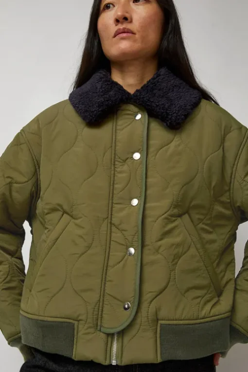 Quilted jacket with a slightly cropped, boxy silhouette and faux fur collar. Features contrasting ribbed waistband and cuff as well as a hidden zip closure with front snap placket. Perfect for everyday wear.