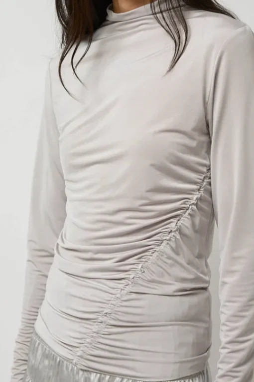 Semi-sheer stretch jersey top with draped mock neck and long sleeves. Twisted side seam. Asymmetrical construction and elasticated hem.