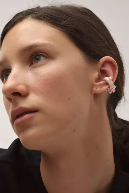 Single statement resin-coated clay ear cuff embellished with an organic smattering of contrasting colors and shapes. Sterling silver hoop. Lightweight, secure, and instantly dresses up any outfit. DETAILS Sterling Silver, Clay, Resin, Japanese Vintage Glass Pearls. Wipe with a soft cloth after use. Store flat. Made in