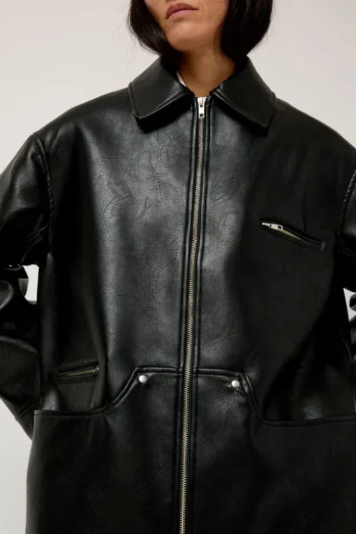 New this season. Vegan leather jacket with pointed collar and front zip closure. Geometric riveted front patch pockets and zip pocket at chest.