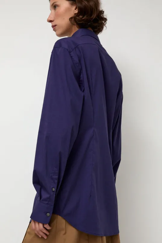 A spin on a classic shirting style. Collared button-down with an elongated silhouette. Front button closure and short pointed collar. Falls just past the hip. Great worn on its own or open as a duster.