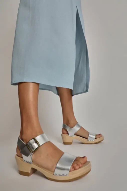 Two Strap Clog on Mid Heel in Silver