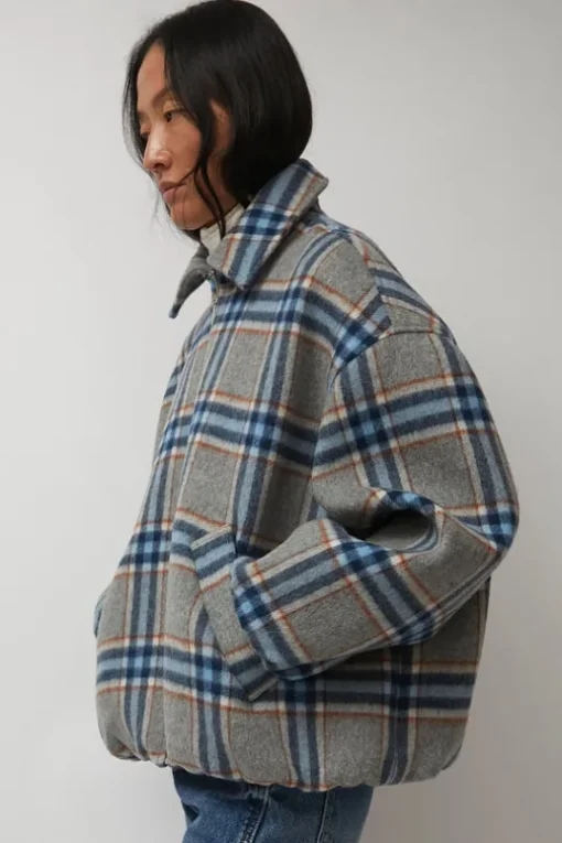 Updated wool-blend bomber jacket in oversized plaid. Super warm, extra thick wool. Pointed collar, front zip closure, and gathered elasticated waistband. Features slanted front welt pockets. An instant outfit maker.